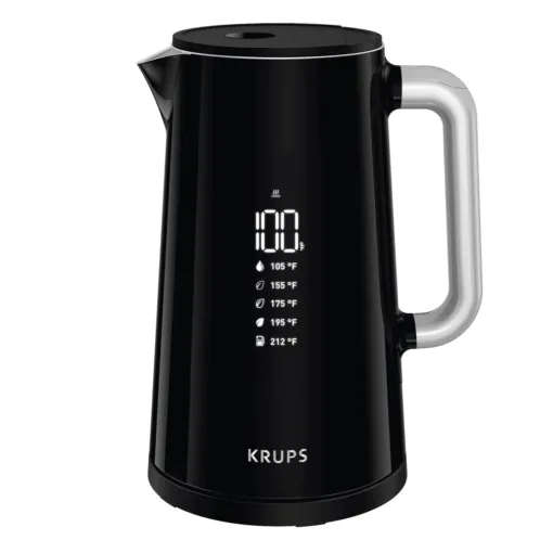 Want to enjoy a hot drink, but can’t get the perfect temperature? The KRUPS Smart Temp Digital Kettle is the ideal solution. As the it heats water, the LED screen displays the current water temperature inside the kettle, so you can see when it reaches the optimal temperature. With five preset temperature settings from 105 degrees F up to 212 degrees F, you can get the best hot drinks at the touch of a button. The temperatures are designed to bring out the best flavor for different teas – white, green, oolong, black and herbal. The kettle has double-wall construction that keeps beverages hot inside, while the kettle is safe to touch on the outside. Such design provides natural insulation to keep water hot longer. It also has an automatic lid opening for easy filling. 360 degree rotational base and cordless body of the kettle make usage convenient. An automatic shut off feature helps to stay worry free and guarantees safety. The kettle holds 1.7 L that is equal to 12 cups. The KRUPS Smart Temp Digital Kettle is the answer to all your kettle needs!